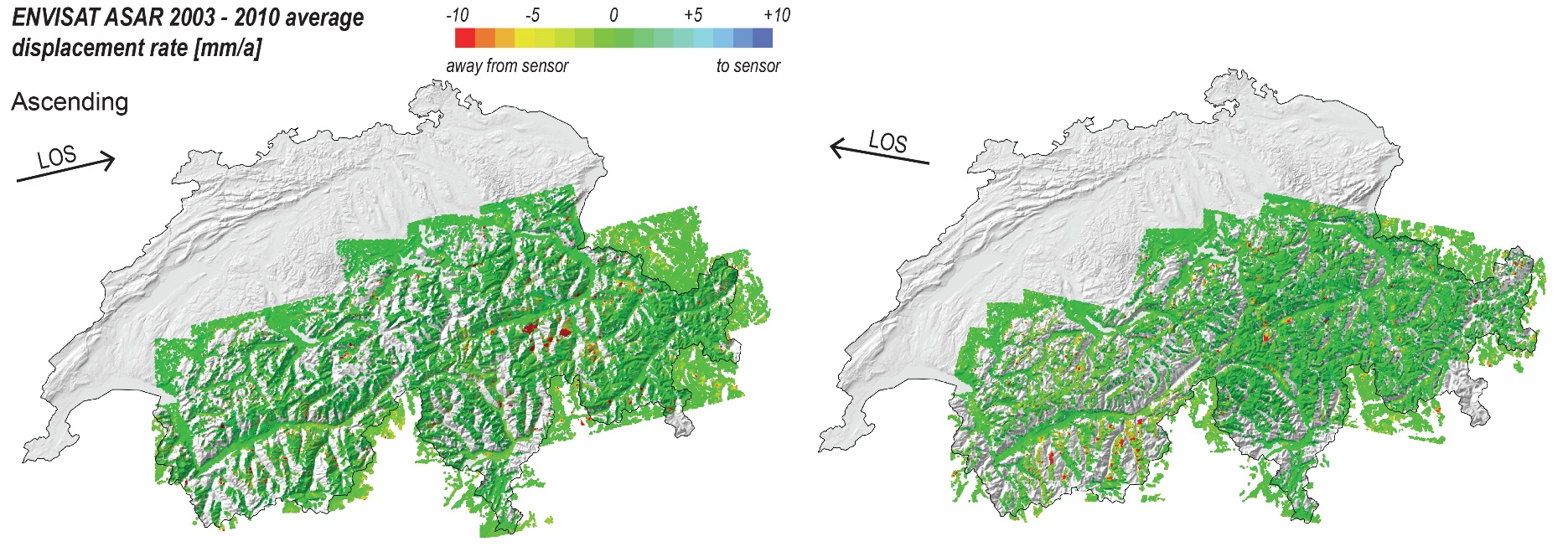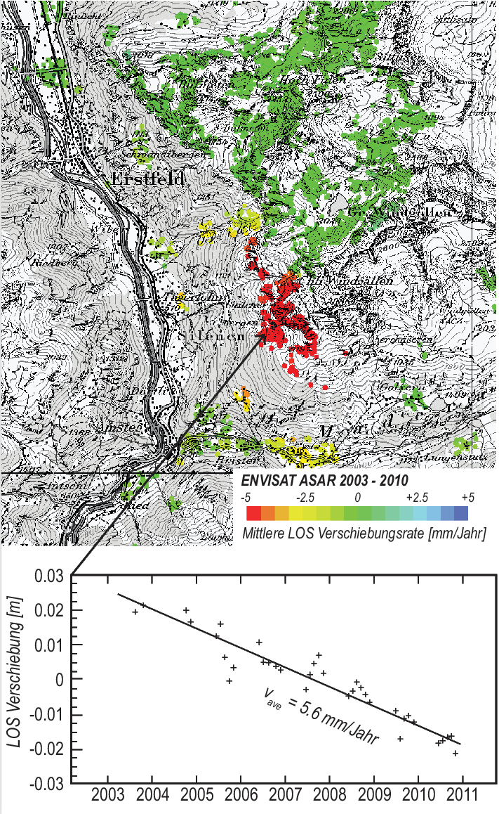 Kleinste Verschiebungen an der Erdoberfläche können mittels Radarsatelliten detektiert werden. Dabei werden mittels spezieller interferometrischer Auswertungen (z.B.: InSAR, Interferometric Point Target Analysis - IPTA) die relativen Verschiebungen der Erdoberfläche z.B. bei aktiven Hangrutschungen in der Grössenordnung von Millimetern bis Dezimetern detektiert.