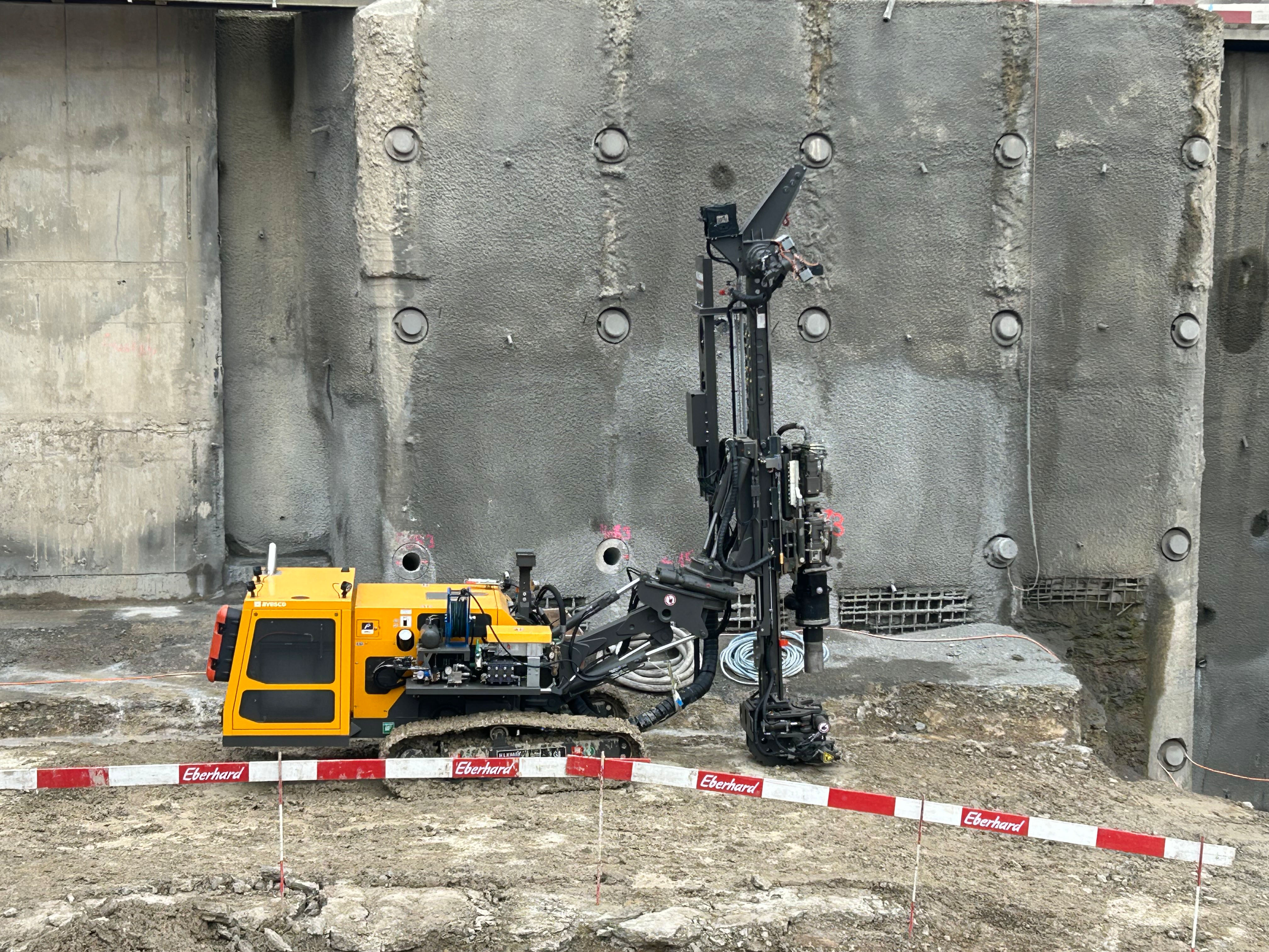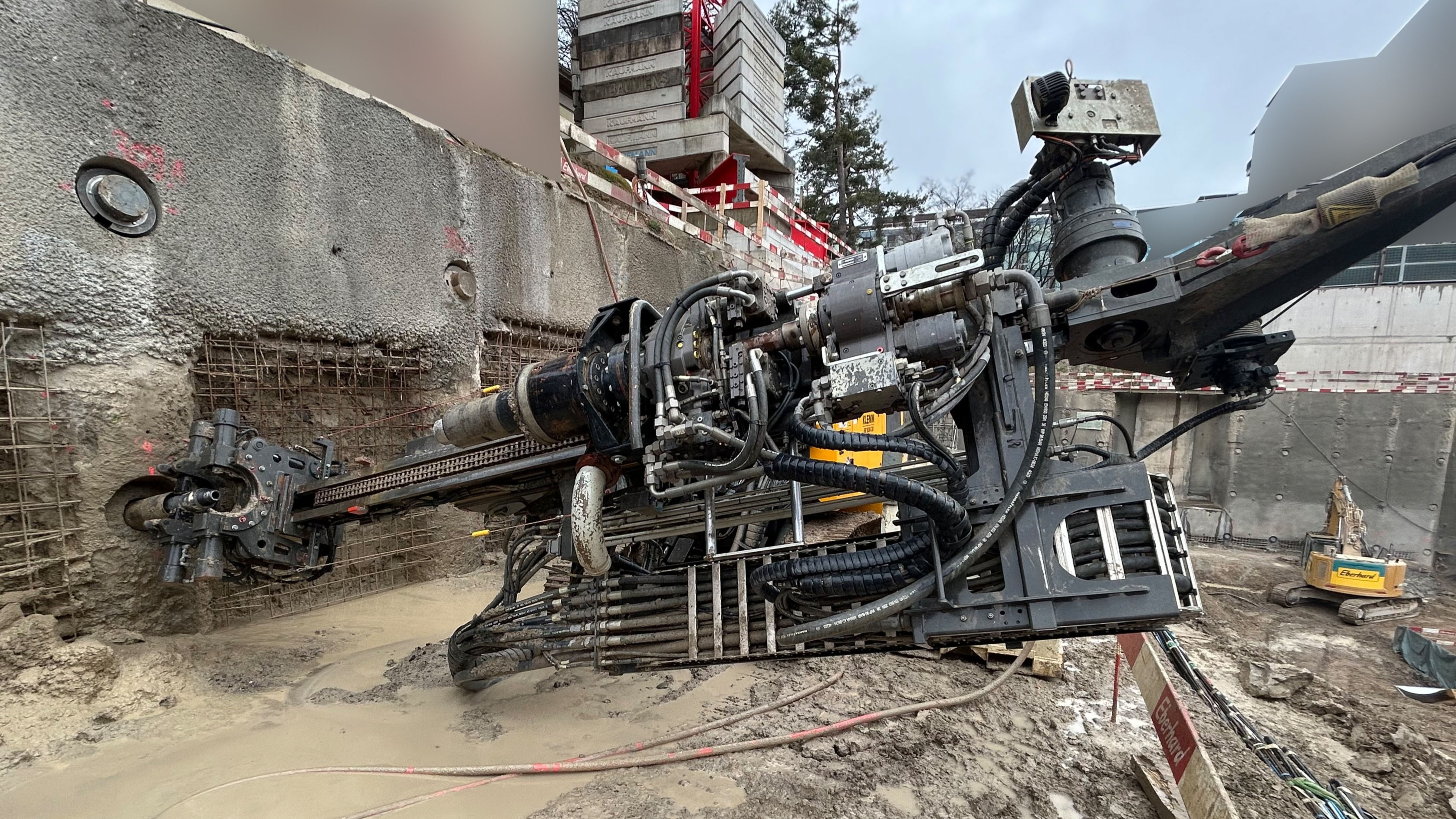 Auf der Grossbaustelle des neuen Universitätsspitals Zürich bewährt sich das leistungsstarke Ankerbohrgerät von KLEMM bei Doppelkopf-Luftbohrungen mit unterschiedlichen Durchmessern, unter anderem für die Herstellung vorgespannter Litzenanker.