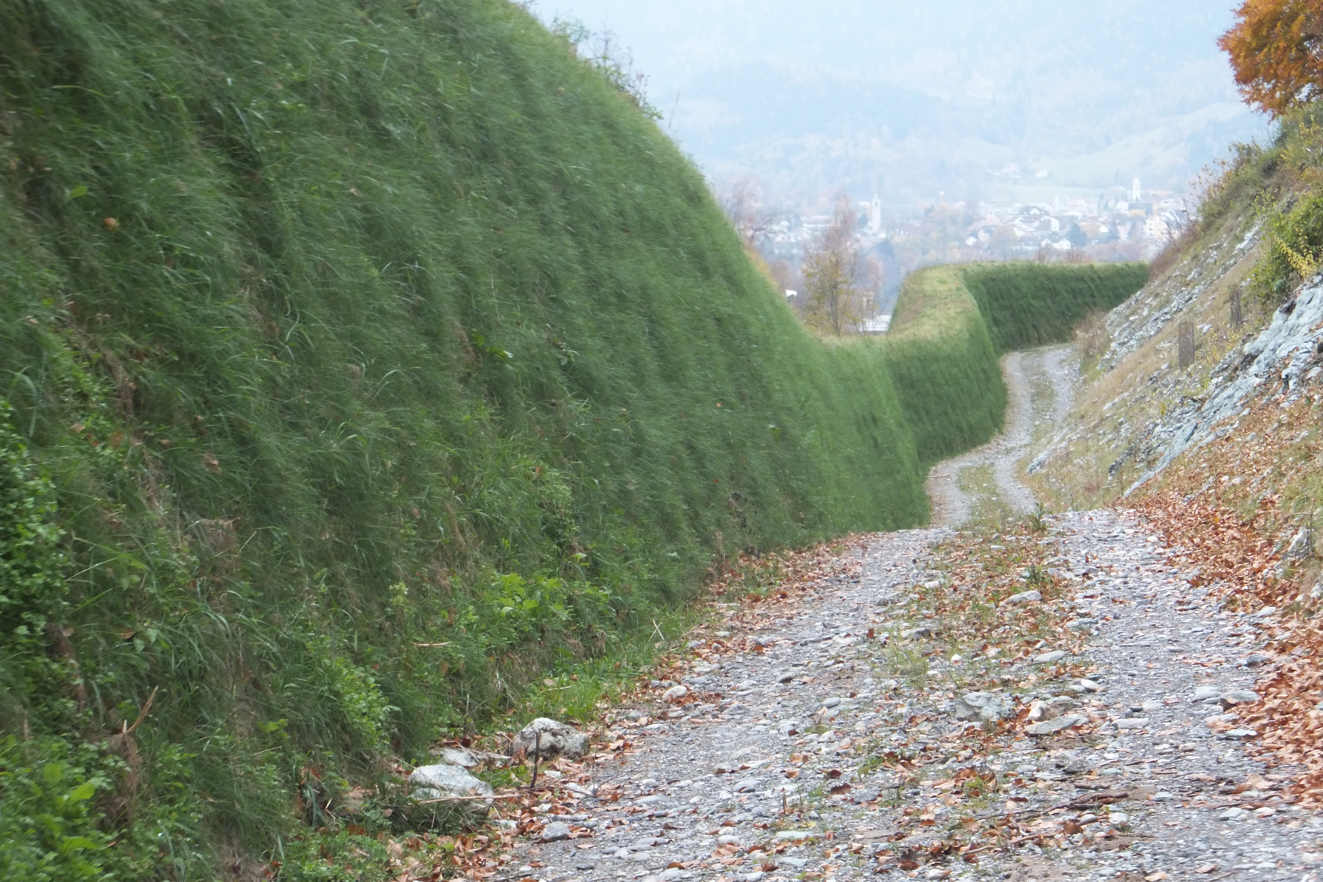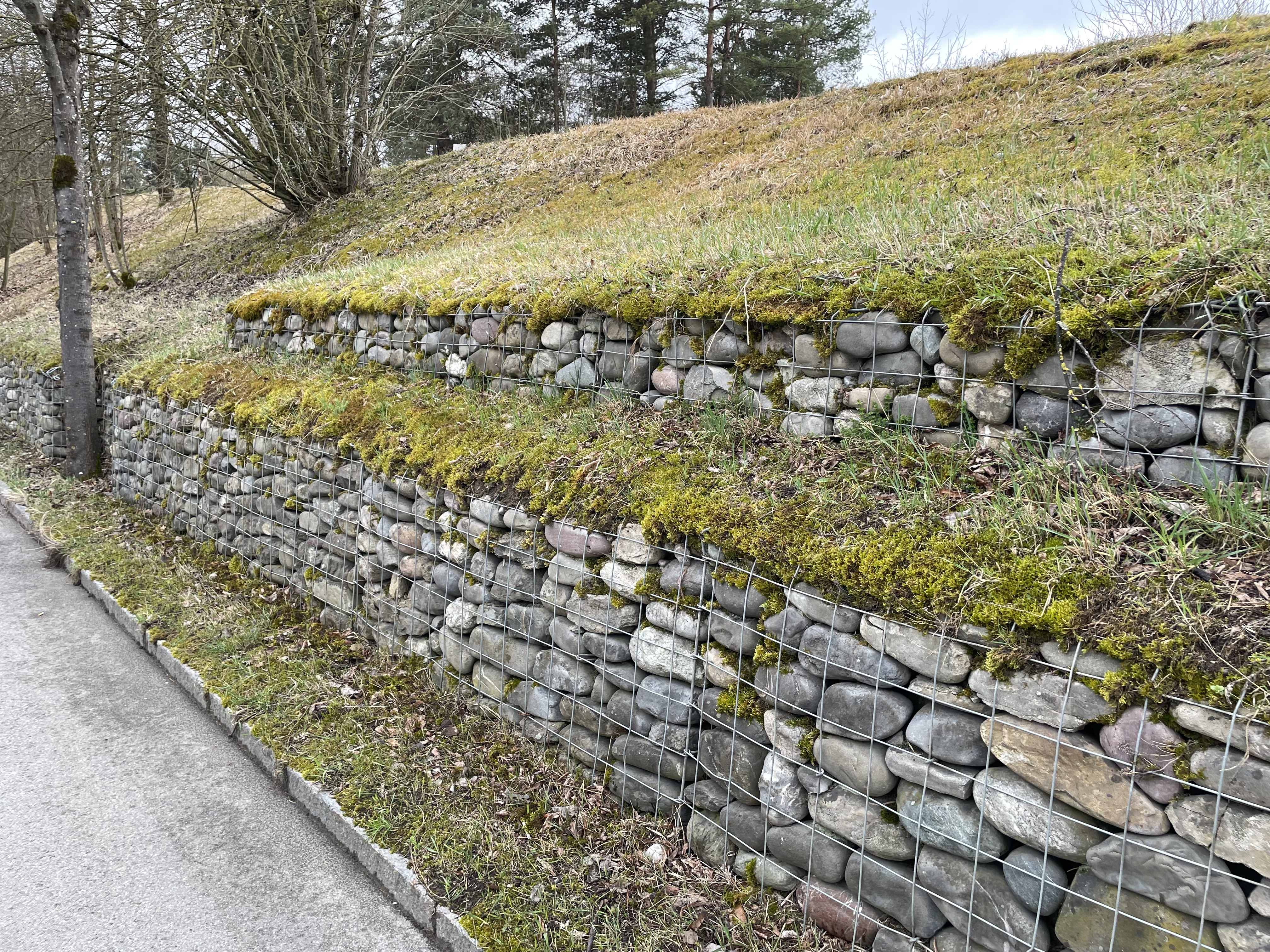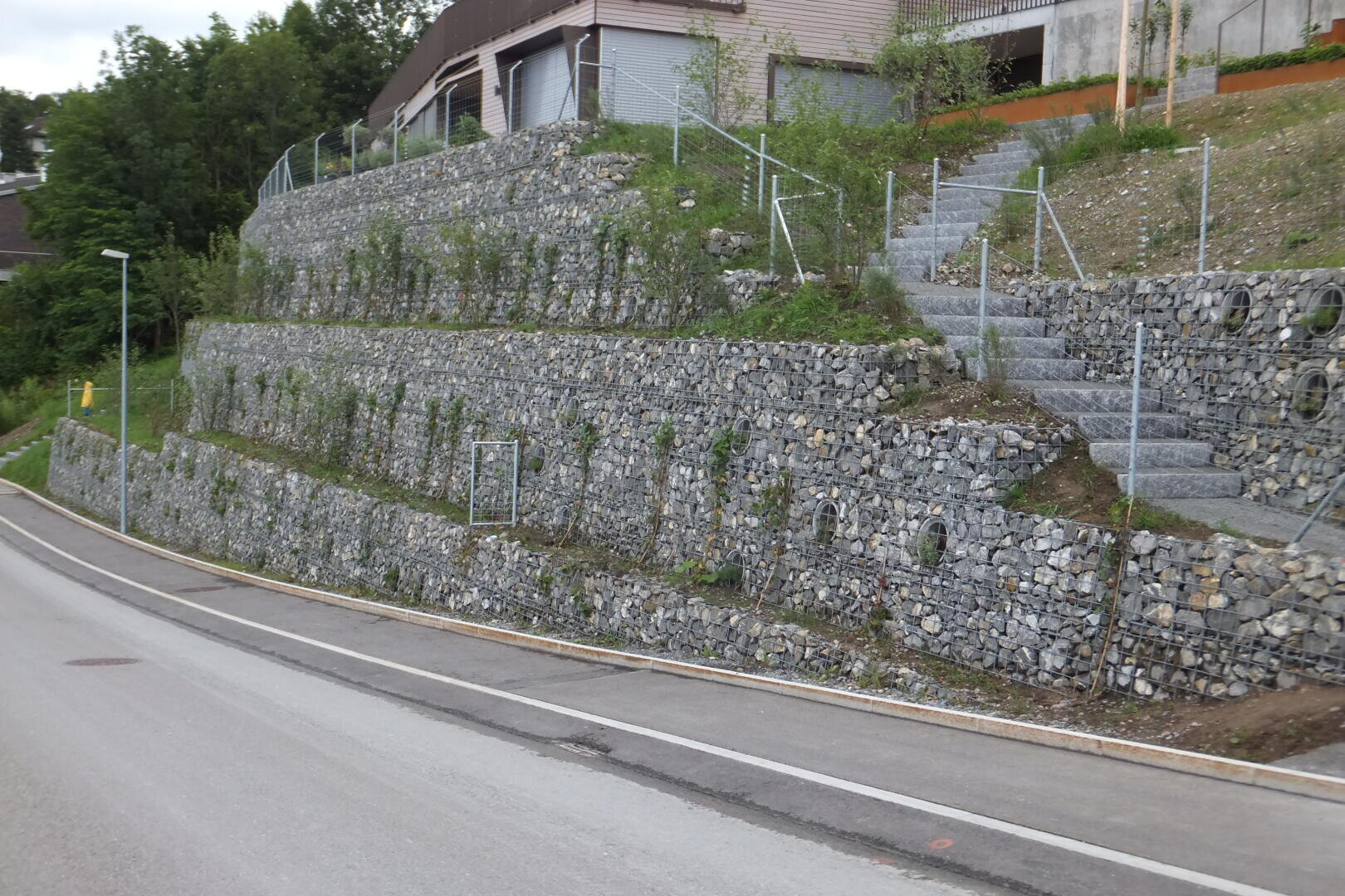 Mit Steinkörben und Winkelgittern in Form von erdbewehrten Stützkonstruktionen lassen sich sehr steile, wirtschaftliche und ökologisch wertvolle sowie durch ihre flexible Bauweise harmonisch in die Landschaft eingefügte Verbauungen zur Hangsicherung und für Schutzbauten erstellen.