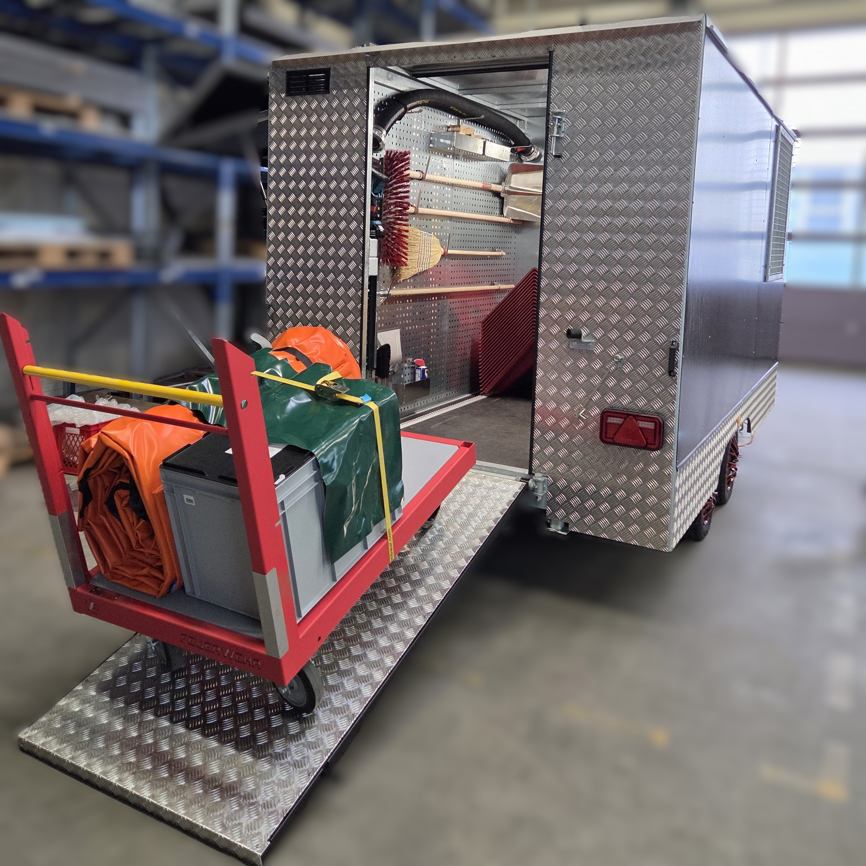 Ob Schutzsäcke, Pumpen oder Notstromaggregate: Unser Anhänger bietet Platz für alle wichtigen Materialien und ermöglicht eine schnelle Koordination am Einsatzort. Die integrierte Rampe erleichtert das Verladen schwerer Geräte, während seitliche Zugänge für maximale Übersicht sorgen.