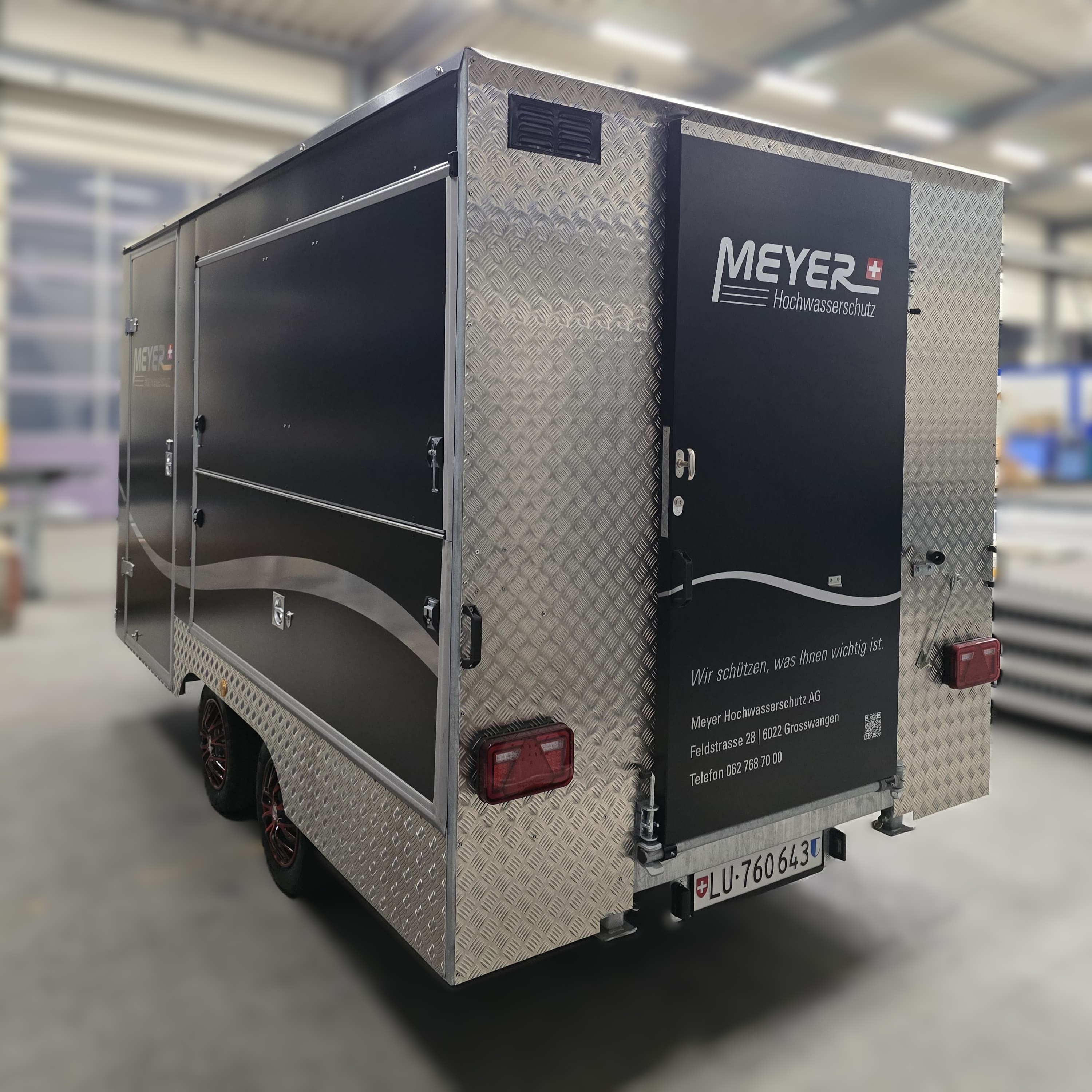 Bereit, wenn’s zählt: Der Meyer Hochwasserschutzanhänger kombiniert Transport, Ordnung und Ausstattung. Alles griffbereit für sichere und schnelle Hochwassereinsätze!