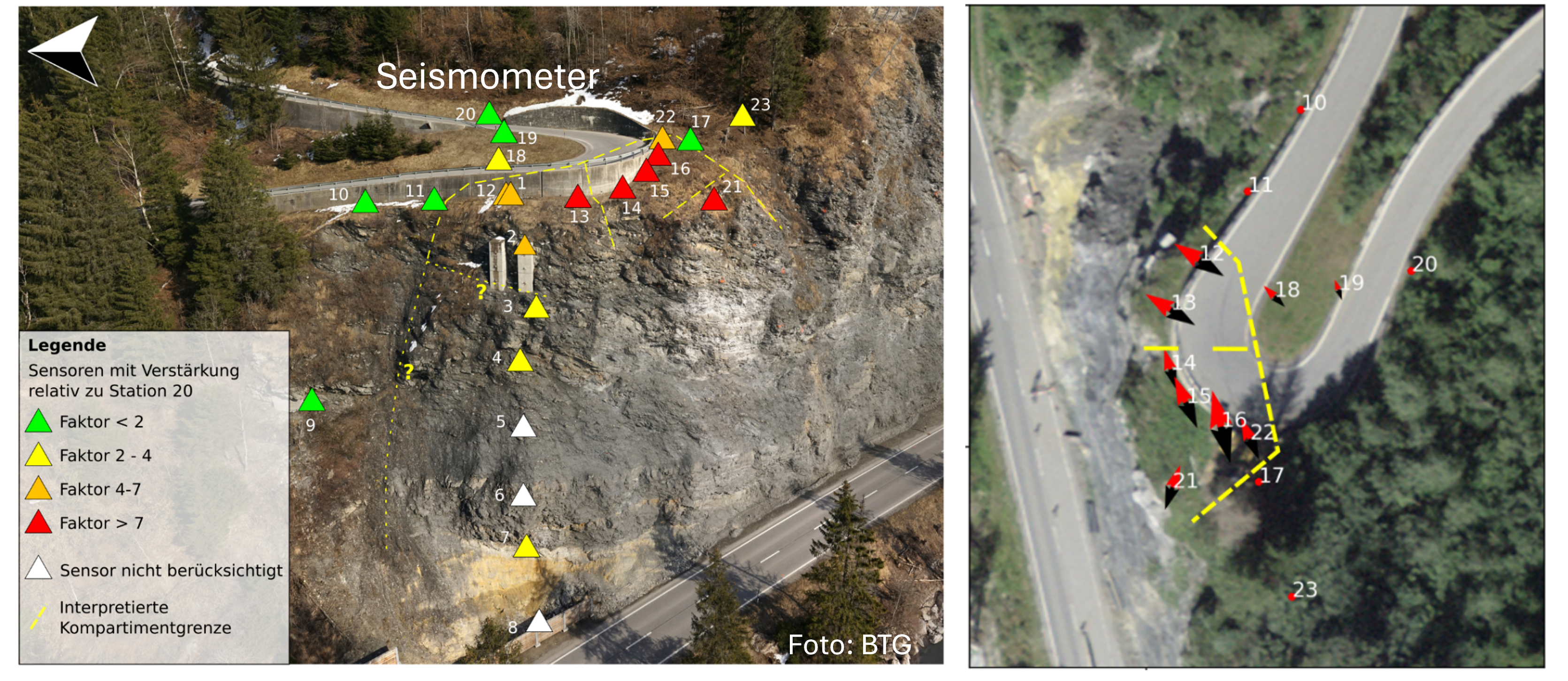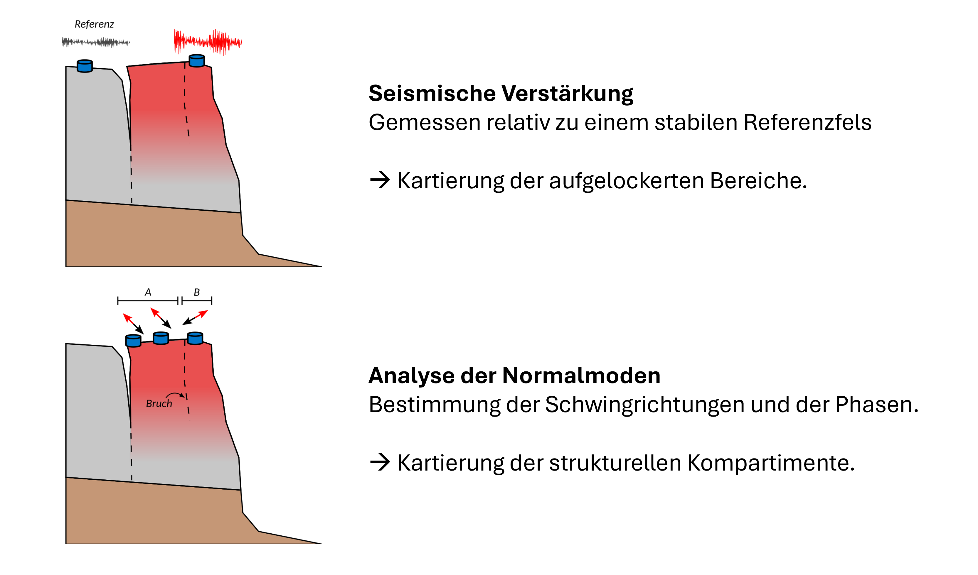 Die seismische Vibrometrie misst die Hintergrundvibrationen mit hochempfindlichen Sensoren für lediglich einige Stunden (z.B. über Nacht). Durch die Bestimmung der seismischen Verstärkung (Amplifikation), Resonanzfrequenzen und Schwingrichtungen lassen sich nach kurzer Zeit bereits daten-basierte Aussagen zur räumlichen Dimension einer Hanginstabilität machen, insbesondere zur Ausdehnung, der strukturellen Gliederung oder dem qualitativen Zerrüttungsgrad. Kombiniert mit klassischen geophysikalischen Methoden, wie Refraktionstomographie, lassen sich auch Aussagen über den vertikalen Aufbau des Hanges machen, wie zum Beispiel der Tiefenlage der Gleitfläche.