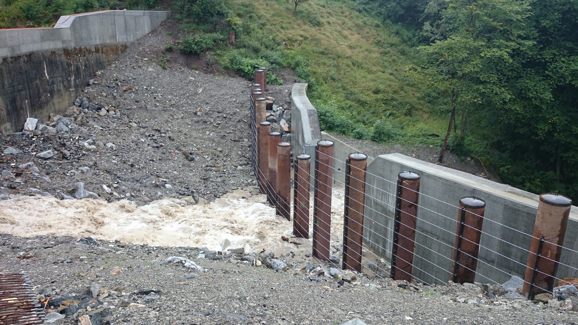 Erwähnenswert ist, dass für den Rückhalt nur noch 2 Kammern verwendet werden, die dritte und vorderste Kammer dient dem Rückhalt von 500 fm3 Holz. Aufgrund von physikalischen Modellen an der VAW wurden diese Konzeption mit verschiedenen Szenarien getestet. Der Geschieberückhalt schützt das Dorf Hergiswil vor grossen Ueberflutungen.
